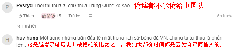 有球迷认为输谁都不能输给中国队,这场比赛是越南足球史上最糟糕的比赛之一(下图)。